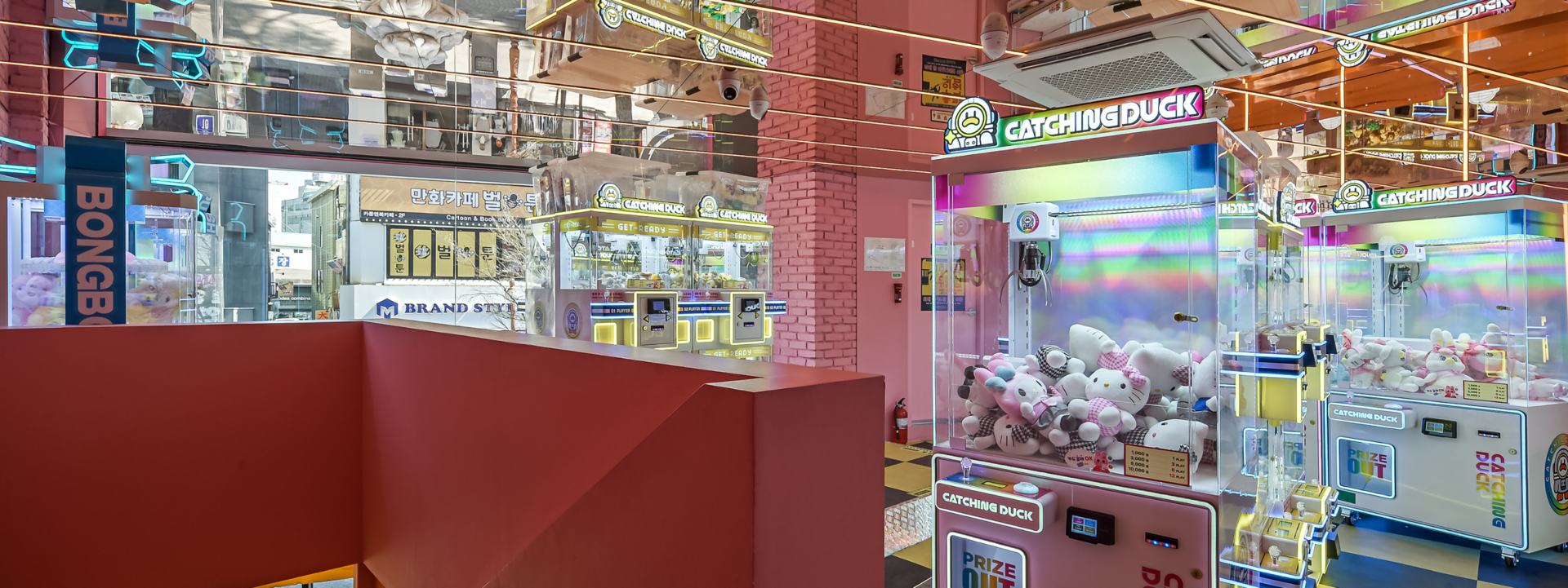 46평 규모의 인형뽑기 플래그십 스토어로, 톡톡 튀는 핑크 컬러와 대형 캐릭터 파사드로 강렬한 시각적 임팩트를 제공합니다.